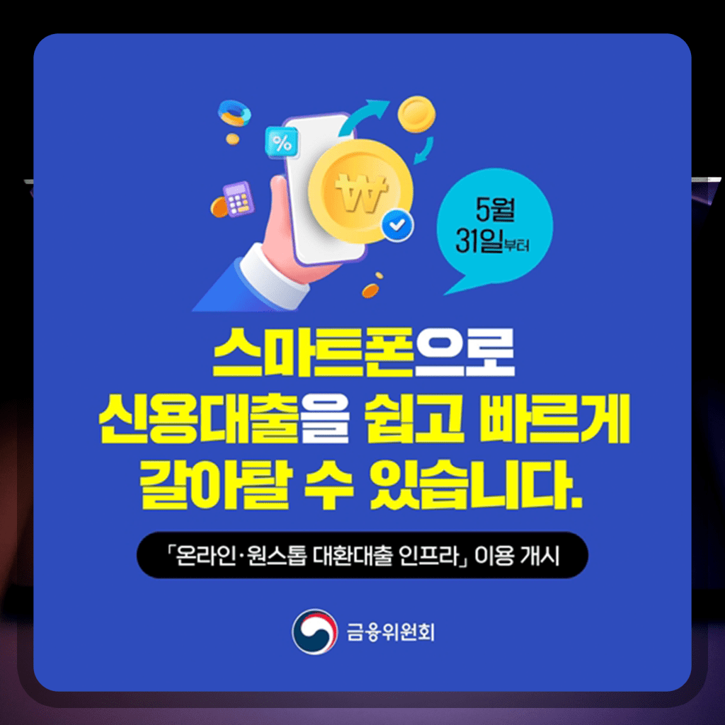 온라인과 원스톱 대환대출 인프라 이용을 개시합니다. 이제 신용대출 갈아타기를 스마트폰으로 할 수 있는 방법을 한 번 알아볼까해요. 금융위원회 발표 자료를 토대로 정리해볼겁니다. 지난 5월 31일부터 시작됐다고 하니 한 번 알아봅시다.