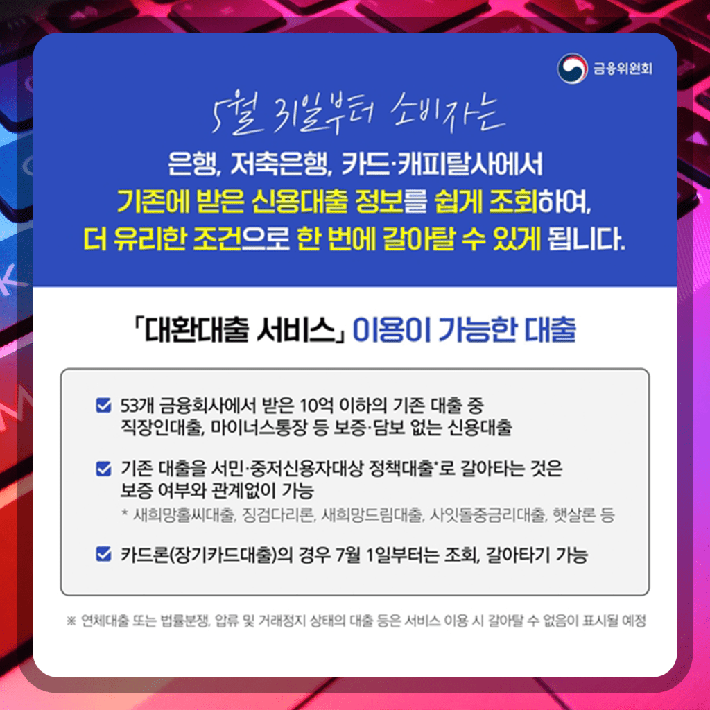 5월 31일부터 소비자는 은행이나 카드, 캐피털 사에서 기존에 받은 신용대출 정보를 쉽게 조회하여 더 유리한 조건으로 한 번에 갈아탈 수 있게 됩니다. 한 번에 갈아탈 수 있게 됐습니다. 이와 같은 신용대출 갈아타기 즉 대환대출 서비스 이용이 가능한 대출이 다음과 같습니다.