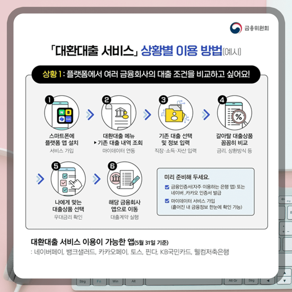 해당 대환대출 서비스 이용이 가능한 앱은 5월 31일 기준은 네이버페이, 뱅크샐러드, 카카오페이, 토스, 핀다, KB국민카드, 웰컴저축은행 앱입니다. 미리 준비해 둘 것은 금융인증서 그러니까 자주 이용하는 은행 앱 또는 네이버, 카카오 인증서 발급입니다. 마이데이터 서비스 가입입니다. 흩어진 내 금융정보를 한 눈에 확인 가능합니다.