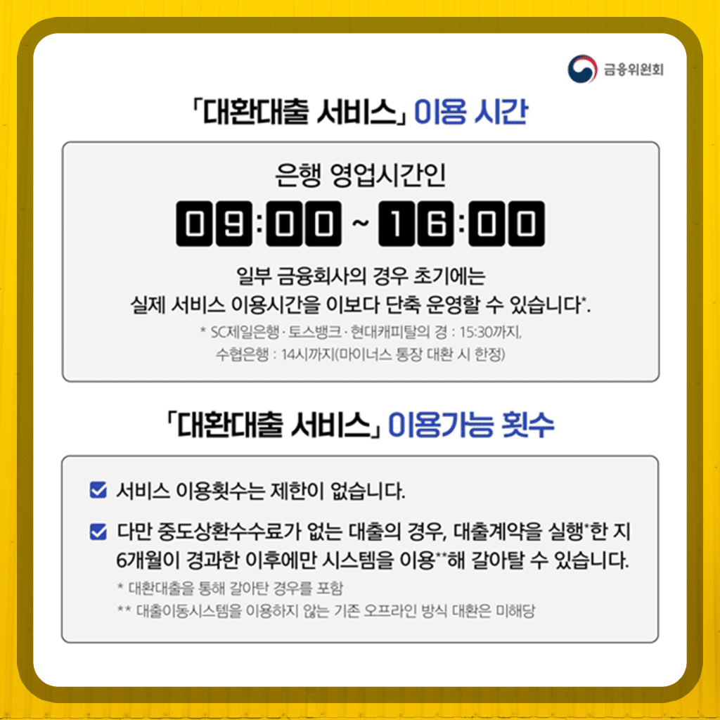 대환대출 서비스 이용가능 횟수는 제한이 없습니다. 다만 중도상환수수료가 없는 대출의 경우 대출계약을 실행한 지 6개월이 경과한 이후에만 시스템을 이용해 갈아탈 수 있습니다. 대환대출을 통해 갈아탄 경우를 포함합니다. 대출이동 시스템을 이용하지 않는 기존 오프라인 방식의 대환은 미해당됩니다.