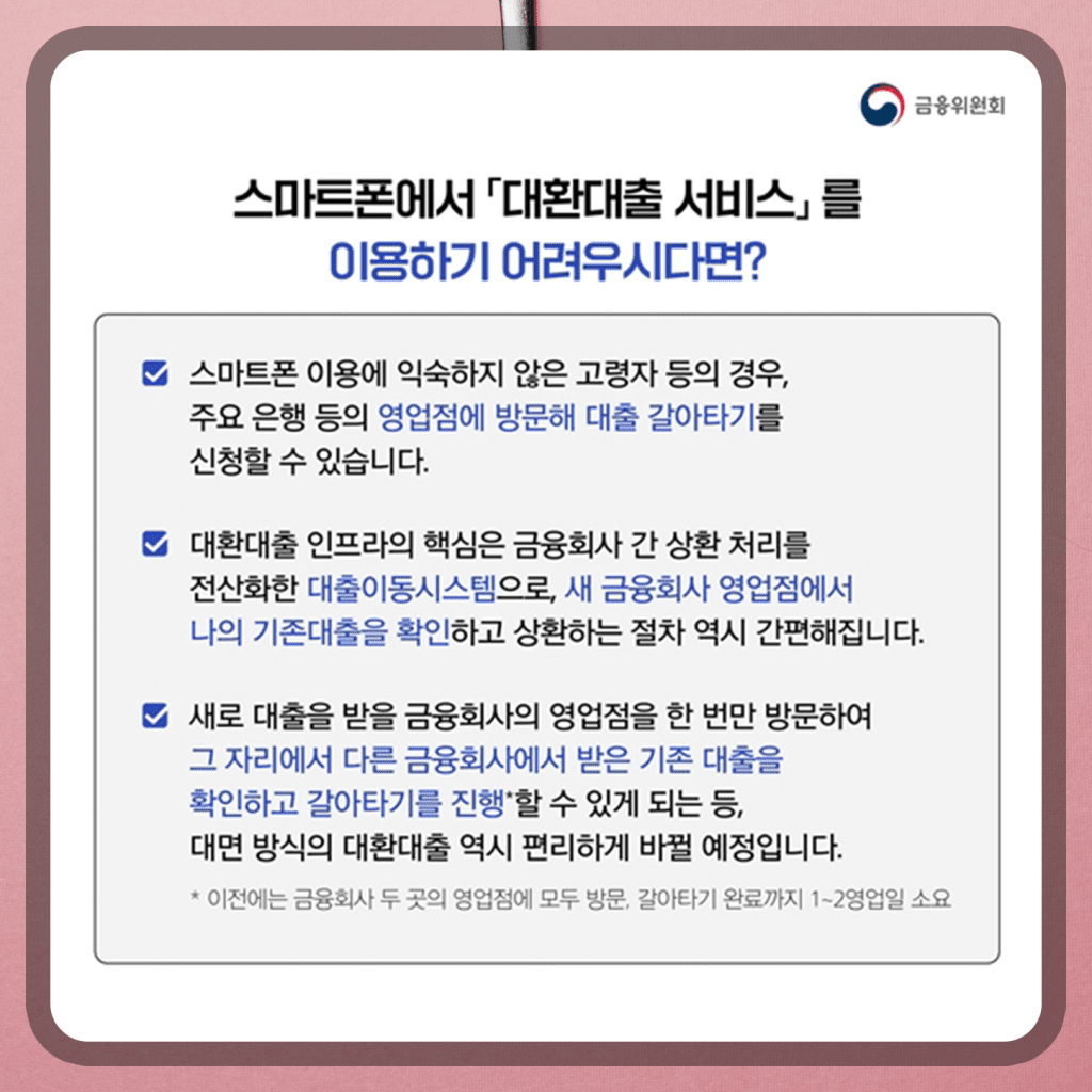 먼저 스마트폰 이용에 익숙하지 않은 고령자 등의 경우 주요 은행 등의 영업점에 방문해 대출 갈아타기를 신청할 수 있습니다. 일단 대환대출 인프라의 핵심은 금융회사 간 상환처리를 전산화 한 대출이동시스템으로 새 금융회사 영업점에서 나의 기존 대출을 확인하고 상환하는 절차 역시 간편해집니다.