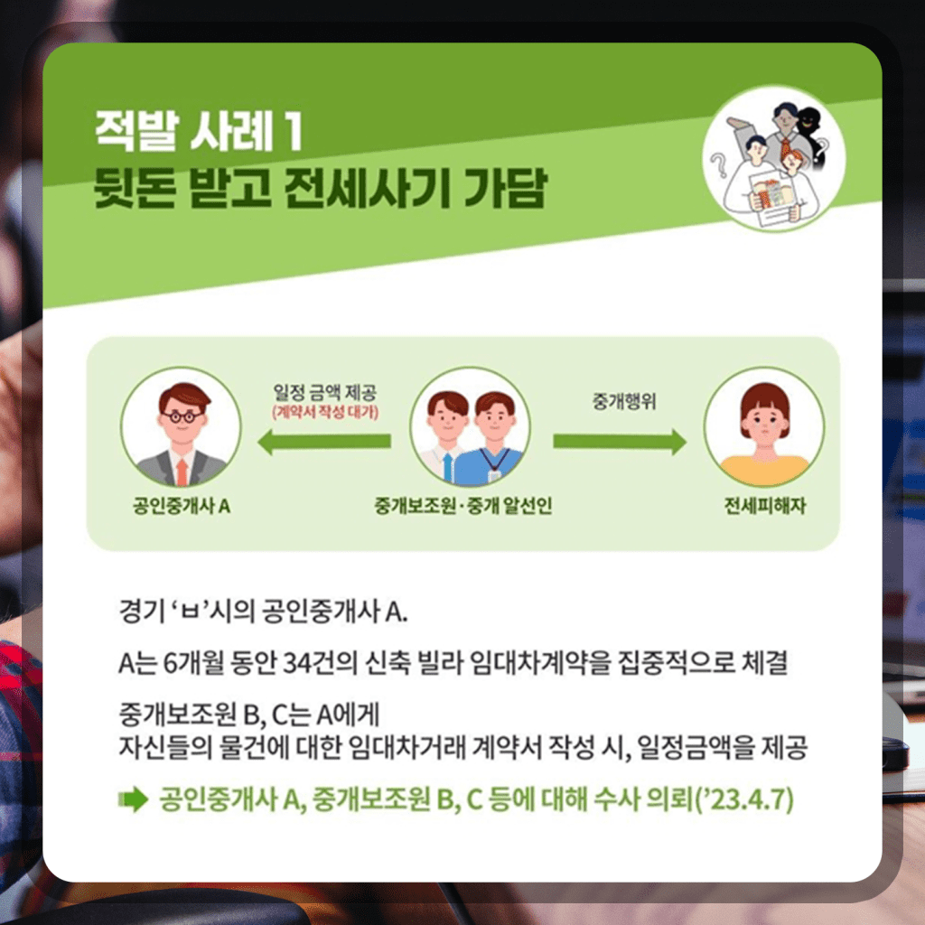 일단 경기도에서 ‘ㅂ’시에서 공인중개사를 하는 A씨가 저지른 일입니다. A씨는 6개월 동안 34건의 신축 빌라 임대차 계약을 집중적으로 체결했습니다. 공인중개사가 아닌 중개보주원인 B와 C씨는 A씨에게 자신들의 물건에 대한 임대차거래 계약서 작성 시에 일정금액을 제공한 사례입니다. 이를 적발한 사람들은 2023년 4월 7일 공인중개사의 A씨, 중개보조원 B와 C씨를 수사의뢰했습니다. 그러니까 중개보조원, 중개알선인인 사람들이 공인중개사인 A씨에게 일정한 수수료를 주고 전세사기에 해당하는 중개거래를 했고, 그에 따른 전세 피해자가 생겨난거죠.