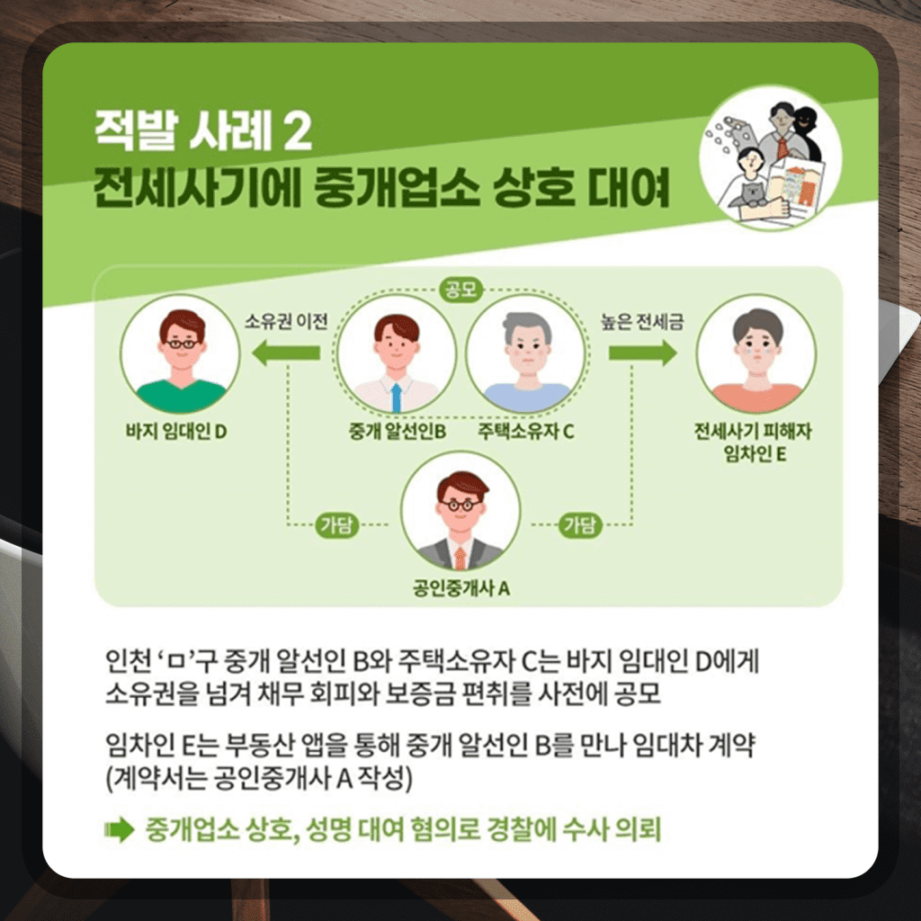 말씀드렸죠. 이게 범죄라는 의식이 없다는 게 문제라고, 심지어 이제는 공인중개사까지 전세사기에 가담하는 일이 생기는 현실이 뼈 아플 뿐입니다. 전세사기 수법 첫 번째는 일단 뒷돈을 받고 전세사기에 가담한 공인중개사입니다.