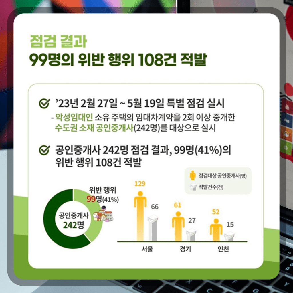 우선 국토교통부는 2023년 2월 27일부터 지난 5월 19일까지 특별 점검 실시를 햇습니다. 악성 임대인 소유 주택의 임대차 계약을 2회 이상 중개한 수도권 소재 공인중개사 242명을 대상으로 실시한 점검입니다. 그런데 세상에 공인중개사 242명 점검 결과 글쎄 무려 99명, 점검 대상 대비 41%에 해당하는 사람이 위반 행위를 했으며 위반행위 건수는 무려 108건이라고 하니 마음이 무척 씁쓸해집니다. 지역적 분포를 보면, 서울이 점검대상 공인중개사 129명 중 적발 66건, 경기도는 61명 중 27건, 인천은 52명 중 15건으로 집계됐습니다.