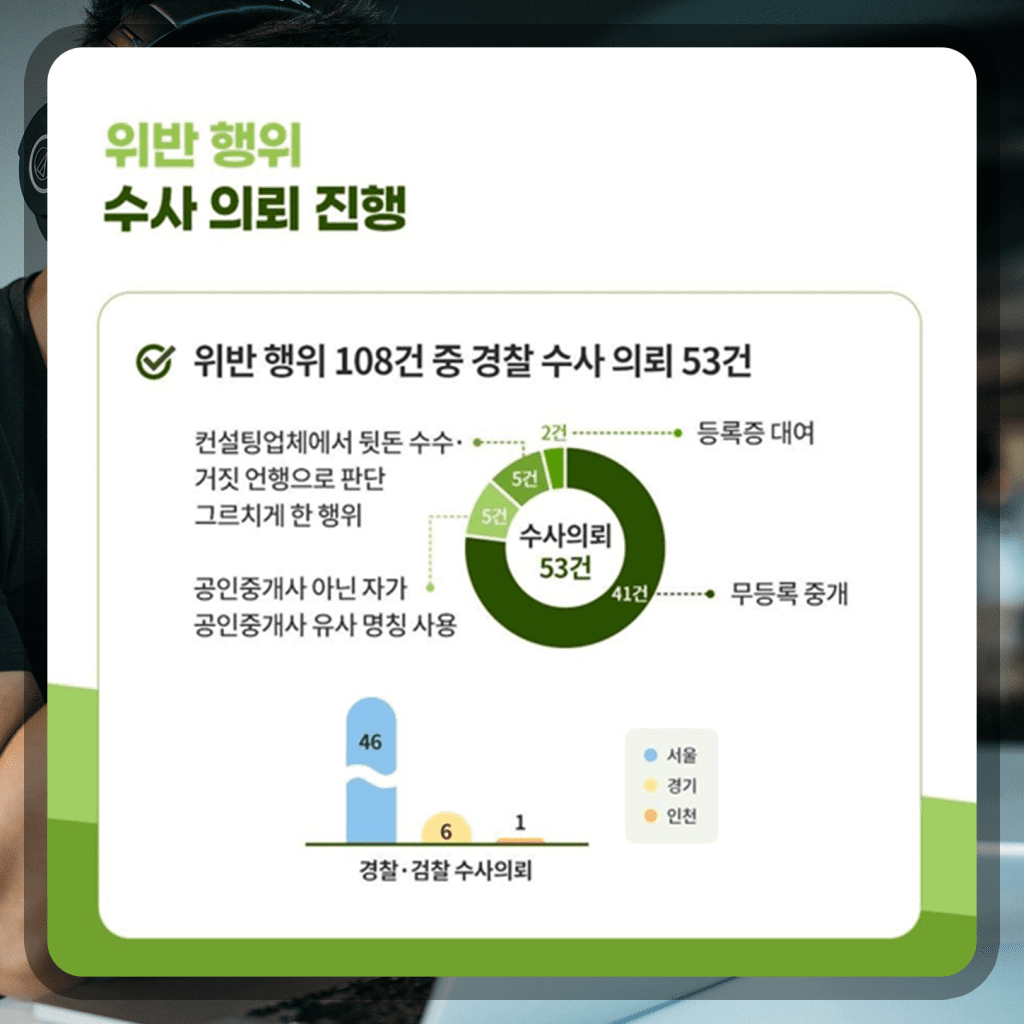 위반 행위로 밝혀진 것은 모두 수사 의뢰를 진행했습니다. 위반 행위 108건 중 경찰 수사 의뢰는 모두 53건입니다. 수사 의뢰 구성을 살펴보면, 일단 컨설팅업체에서 뒷돈을 수수, 거짓 언행으로 판단 그르치게 한 행위는 모두 5건, 등록증 대여가 2건, 공인중개사 아닌 자가 공인중개사 유사 명칭 사용된 경우 5건, 무등록 중개가 가장 많은데 41건입니다. 서울이 46건으로 가장 많고, 경기도는 6건, 인천은 1건입니다.