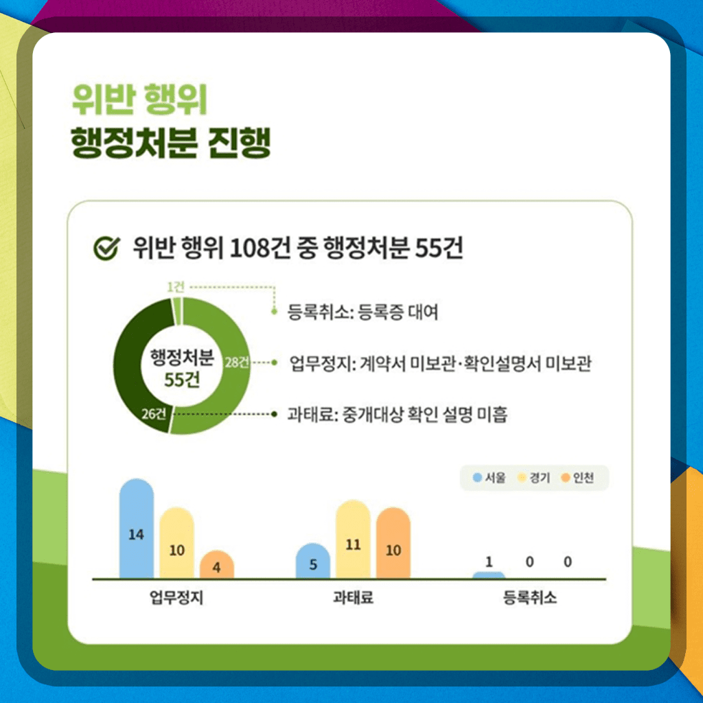 수사의뢰 외에도 행저처분은 55건 진행했습니다. 위반 행위는 108건 중 55건! 구성을 봅시다. 일단 등록취소 등록증 대여가 1건, 다음으로 26건의 과태료 중새대상 확인 설명의 미흡, 마지막으로 업무정지 즉 계약서 미보관, 확인설명서 미보관이 28건입니다.