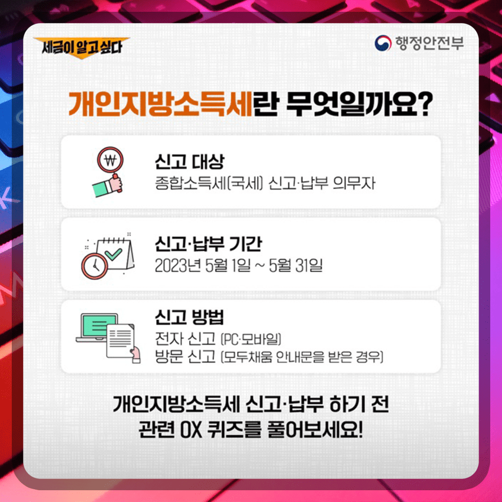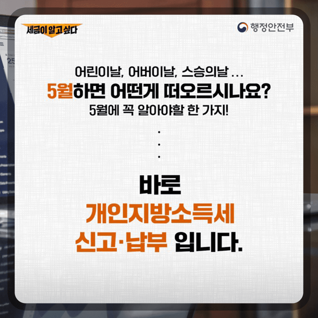 5월 하면 떠오르는 게 어린이날, 어버이날, 스승의날? 또 하나 5월에 꼭 알아야하는 한 가지! 바로 개인지방소득세와 종합소득세 신고와 납부 방법입니다. 오늘은 이 방법 정리와 함께 환급일에 대해 알아보겠습니다.