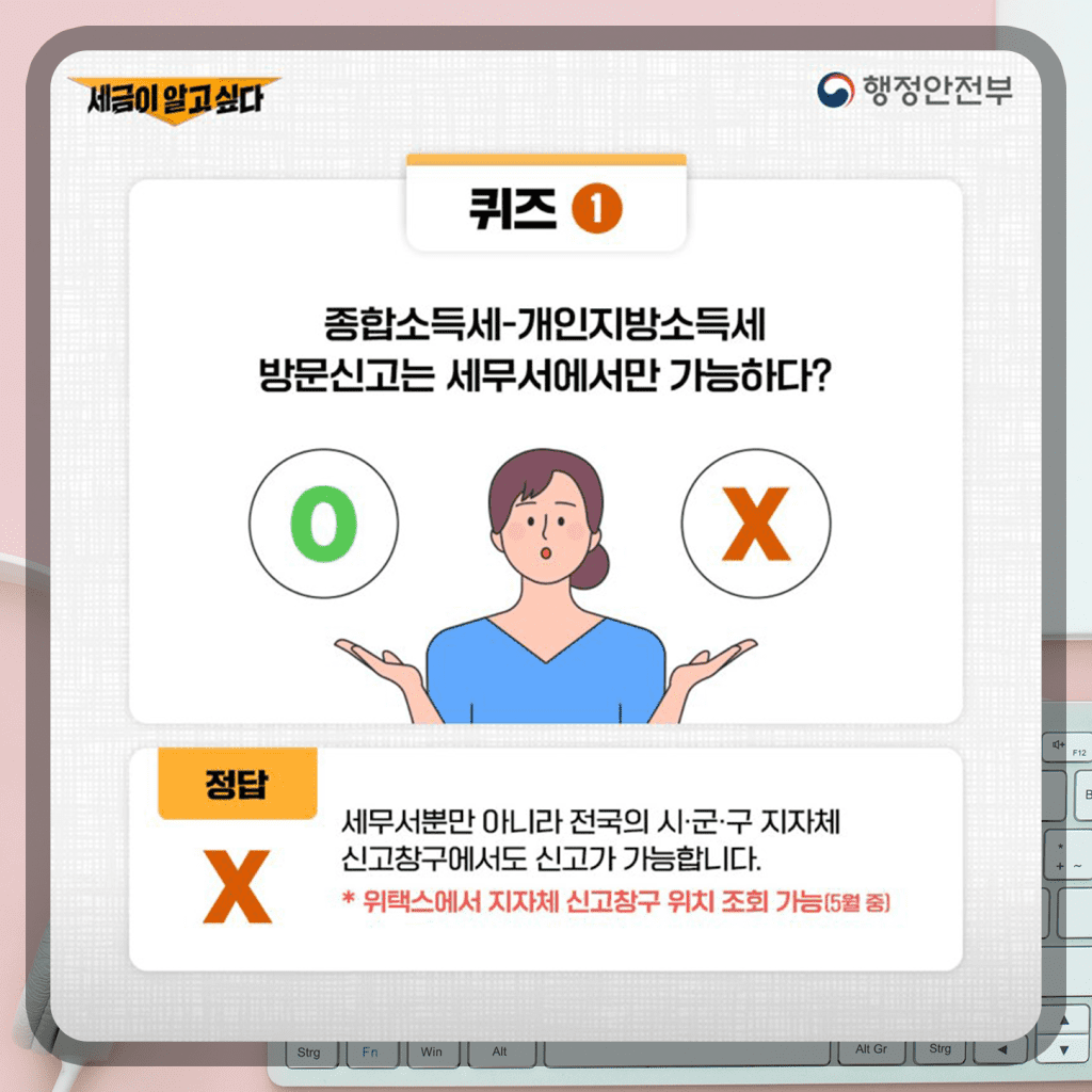 종합소득세와 개인지방소득세 방문 신고는 세무서에서만 가능한가요? 아닙니다. 세무서뿐만 아니라 전국의 시, 군, 구 지자체 신고 창구에서도 신고가 가능합니다. 5월 중이라면 위택스에서 지자체 신고 창구 위치 조회가 가능하니까 거길 이용하시면 됩니다.