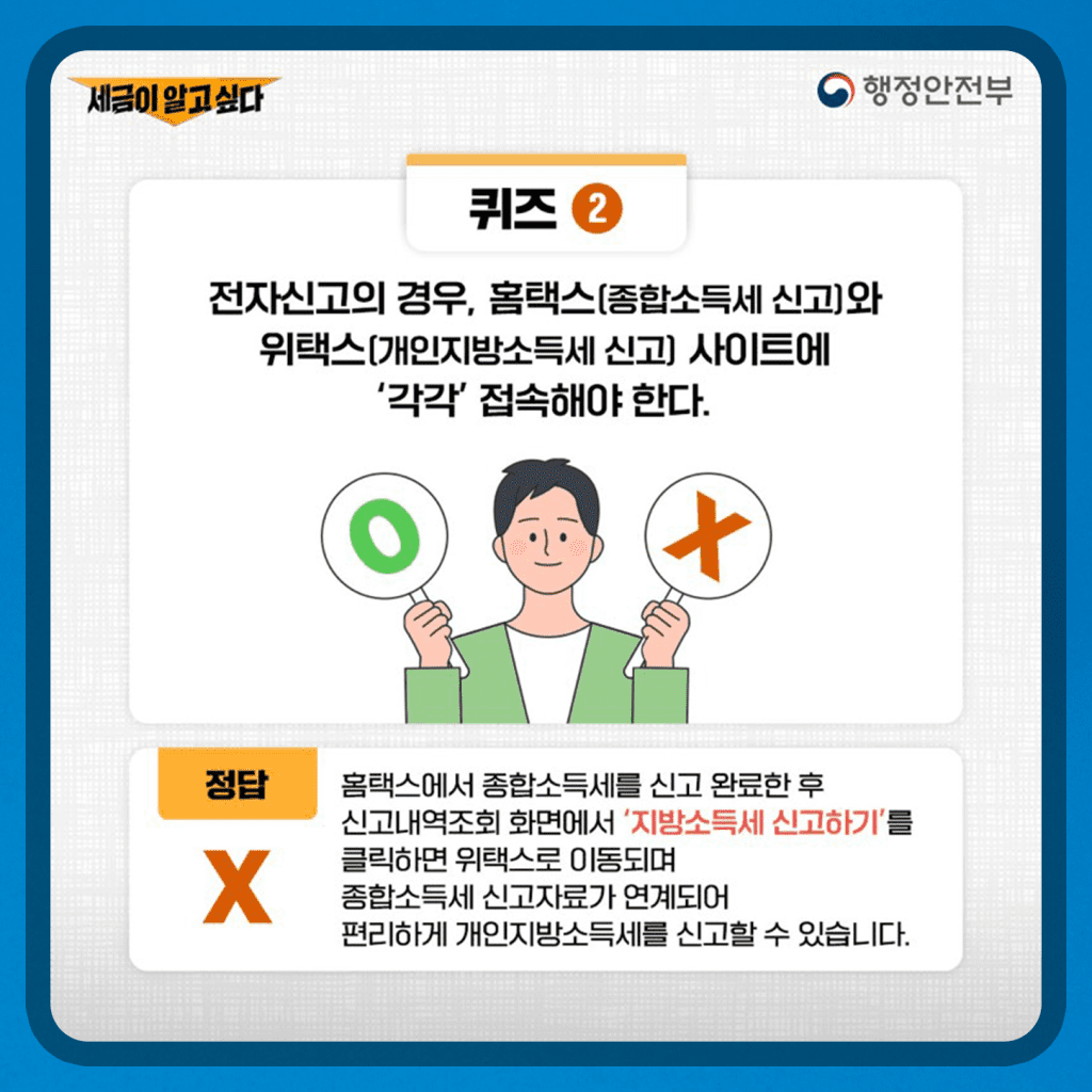 전자 신고를 할 경우 홈택스 종합소득세 신고와 위택스 개인지방소득세 신고 사이트에 각각 접속해야 하나요?. 답은 아닙니다. 홈택스에서 종합소득세 신고를 완료한 후 신고내역조회 화면에서 “지방소득세 신고하기”를 클릭하면 위택스로 이동되며, 종합소득세 신고자료가 연계되어 편리하게 개인지방소득세를 신고할 수 있습니다.