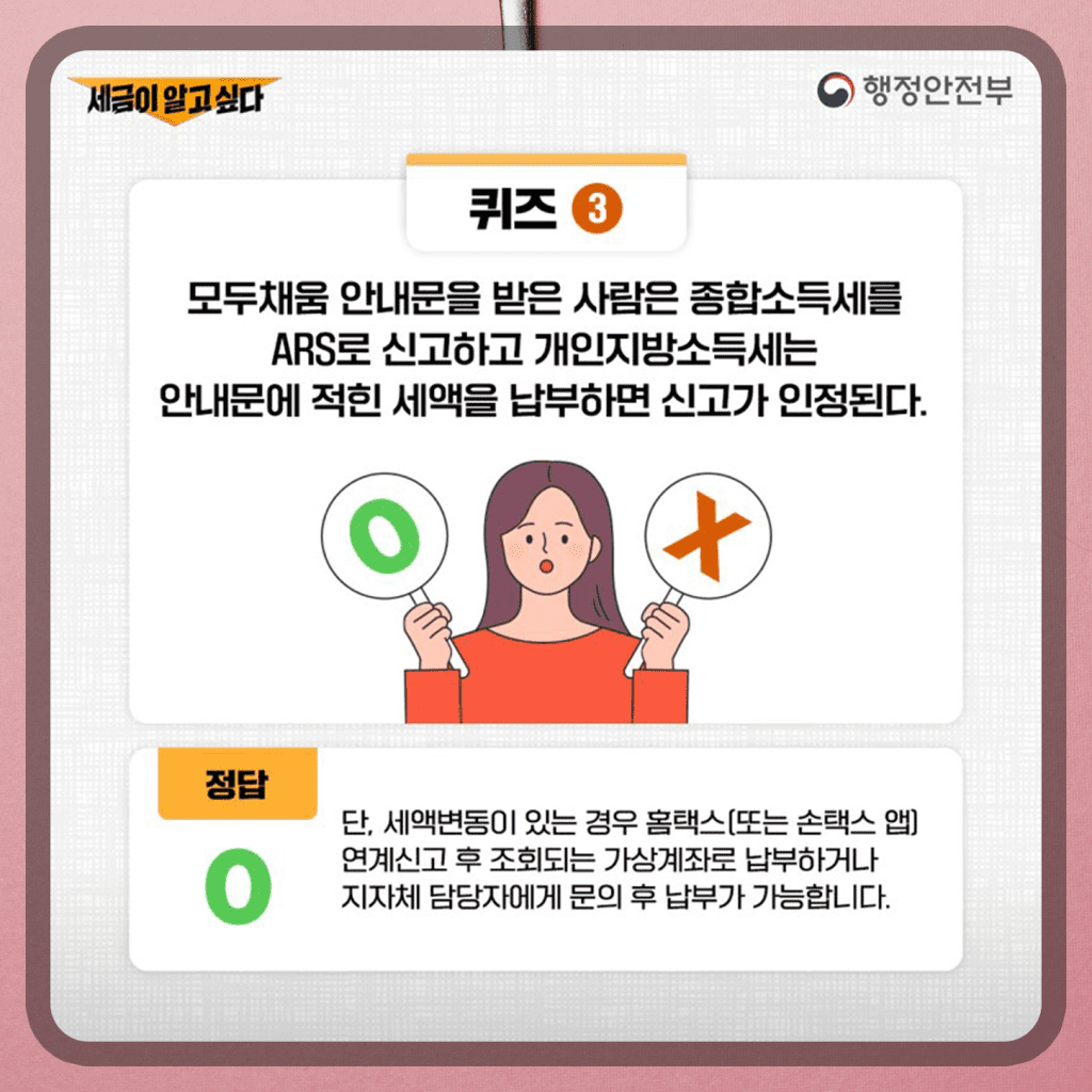 모두채움 안내문을 받은 사람은 종합소득세를 ARS로 신고하고, 개인지방소득세는 안내문에 적힌 세액을 납부하면 신고가 인정된다? 맞습니다. 단, 세액 변동이 있는 경우 홈택스 또는 손택스 앱을 통해 연계 신고 후에 조회되는 가상계좌로 납부하거나 지자체 담당자에게 문의 후 납부가 가능합니다.