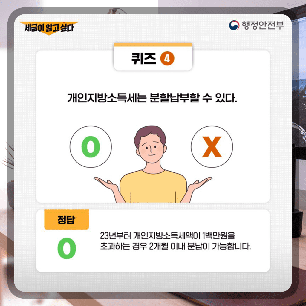 마지막으로 개인지방소득세는 분할납부할 수 있다? 네 가능합니다. 이번 2023년부터 개인지방소득세액은 1백만원을 초과하는 경우 2개월 이내 분납이 가능합니다. 매년 5월 31일까지 꼭 챙겨서 신고 납부해주세요.