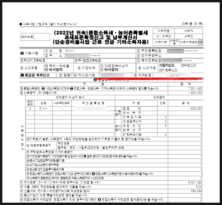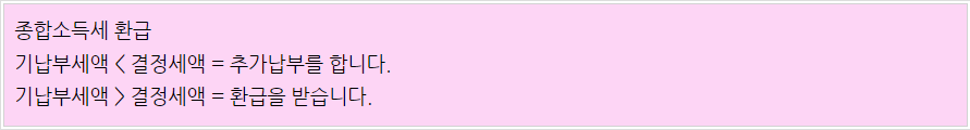 종합소득세는 기납부된 세액과 종합소득세 계산을 통해 나온 결정세액과 비교하여 환급 여부가 결정되게 됩니다. 또 혹시 기납부 된 세액이 종합소득세 결정세액보다 많은 경우 과다 납부된 세액을 다시 환급받을 수 있게 됩니다.