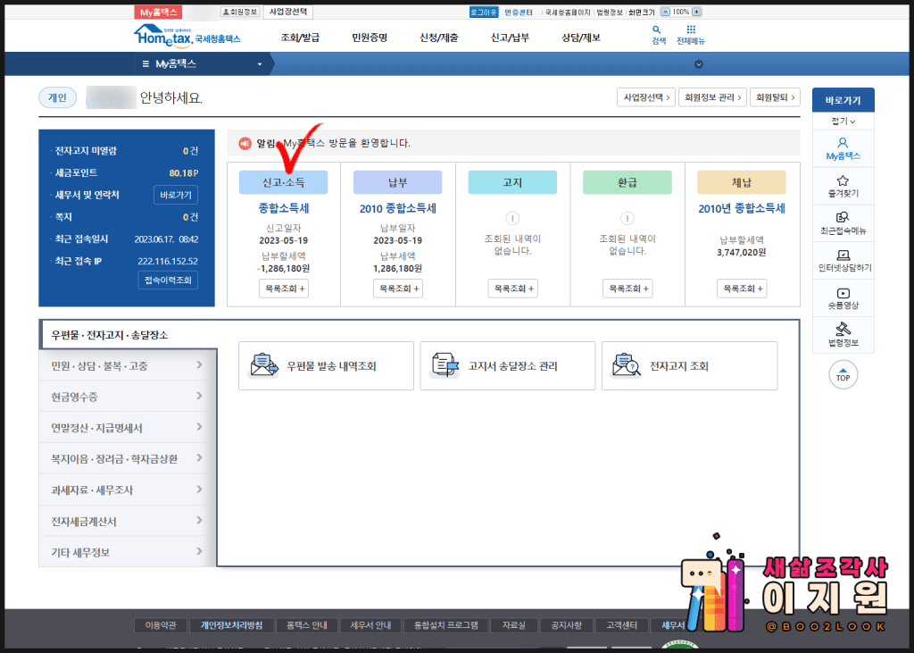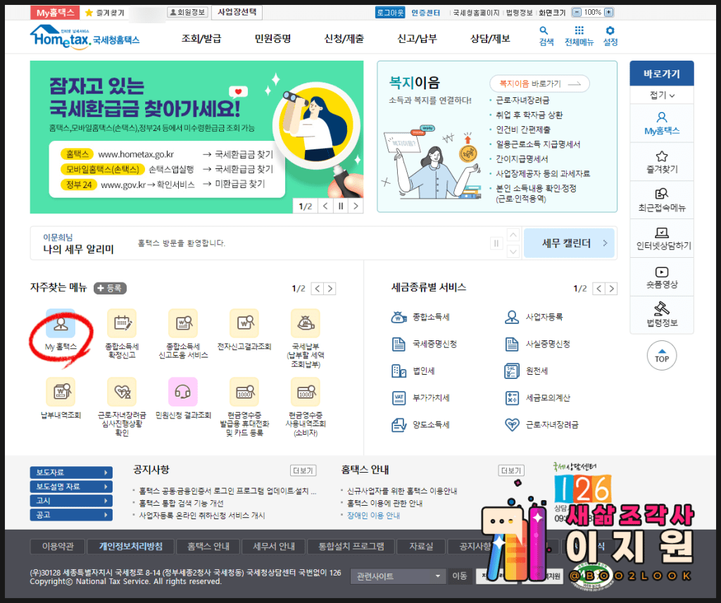 국세청 홈택스 또는 애플리케이션 손택스에서 5월 종합소득세 신고 분에 대해 환급 여부를 확인해 볼 수 있습니다. 오늘은 홈페이지 홈택스 기준으로 종합소득세 환급 확인 방법을 알아보겠습니다. 먼저 중간의 자주찾는 메뉴 중 My 홈택스 메뉴를 선택해주세요.