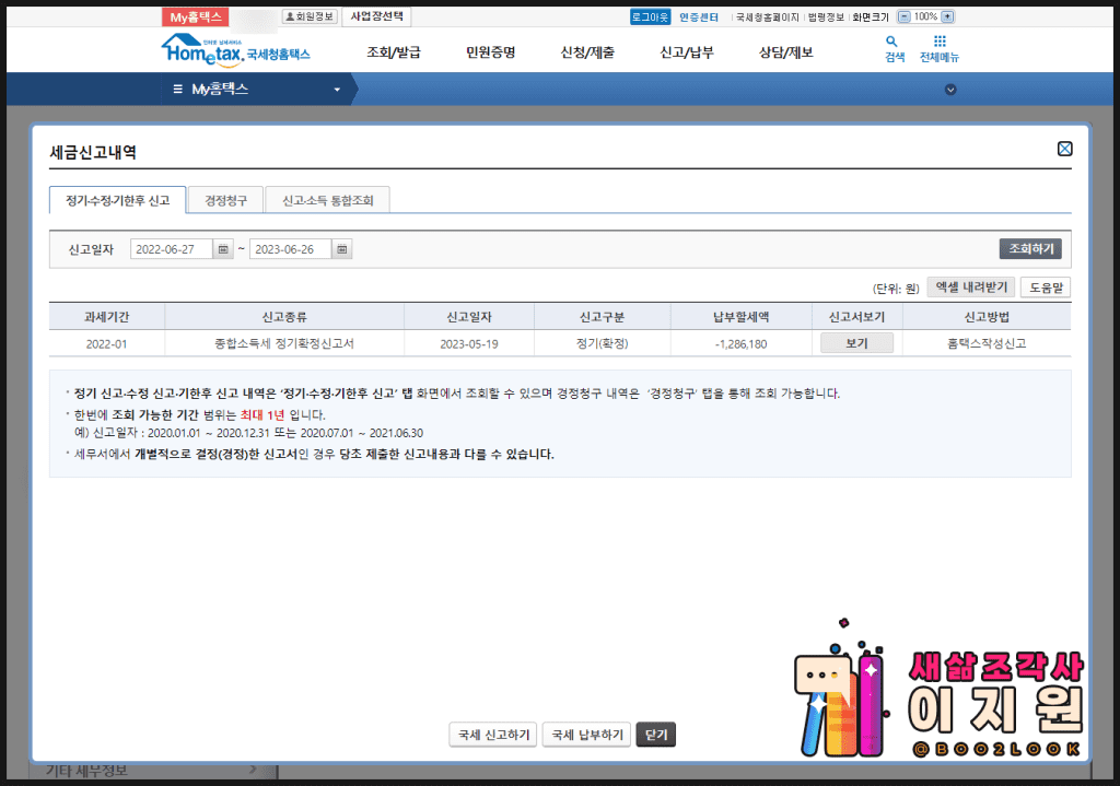 해당 메뉴를 선택핫기면 종합소득세 신고서를 확인할 수 있습니다. 종합소득세 환급 계좌가 기억나지 않는다면 신고 시 기재하였던 계좌도 확인할 수 있습니다.