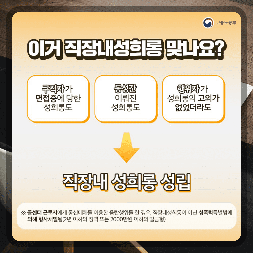첫째, 구직자가 면접 중에 당한 성희롱도 해당 됩니다. 무슨? 직장 내 성희롱에 해당됩니다. 직접 입사하지 않았어도 말입니다. 둘째, 동성 간 이뤄진 성희롱도 성희롱이고 괴롭힘입니다. 꼭 이성 간에 일어나는 일만 해당되지 않아요. 셋째, 행위자가 성희롱의 고의가 없었더라도 받는 사람이 심히 모욕감 불쾌감을 느꼈다면 성희롱에 해당되는 것이죠. 이런 경우 직장 내 성희롱이 성립됩니다.