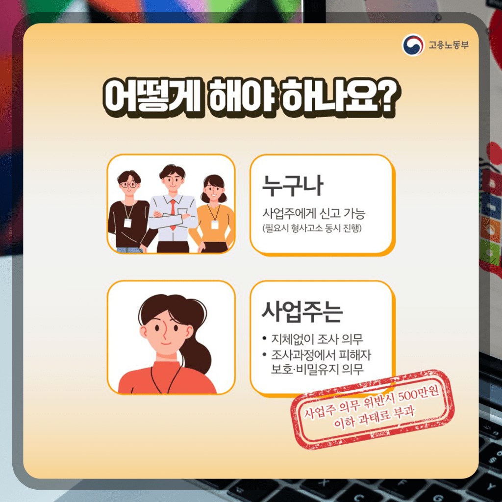 그럼 직장 내 성희롱이나 괴롭힘을 당한 당사자이거나 이를 발견한 사람은 어떻게 해야 할까요? 당사자나 이를 발견한 사람 누구나 우선 사업주에게 이 같은 사실을 알리고 사업주에게 신고 가능합니다. 필요하다면 형사고소를 동시에 진행할 수도 있어요. 이를 신고받은 사업주는 지체없이 조사 의무, 조사과정에서 피해자 보호 비밀유지 의무가 있습니다. 사업주 의무 위반시에는 500만원 이하 과태료를 부과받을 수 있습니다.