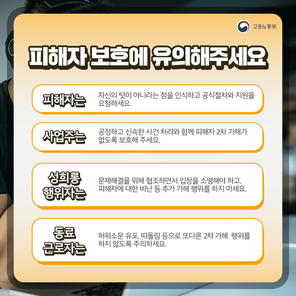 뭐니뭐니 해도 피해를 당한 당사자에 대한 보호입니다. 피해자는 자신의 탓이 아닌 점을 인식하고 공식절차와 지원을 요청하세요. 절대 절대 피해자의 잘못이 아닙니다. 성희롱을 한 괴롭힘을 한 가해자의 잘못이지 피해자의 잘못이 아닙니다. 사업주는 공정하고 신속한 사건 처리와 함께 피해자 2차 가해가 없도록 보호할 책임이 있습니다. 법이 아니더라도 최소한의 양심이 있다면 말이죠.