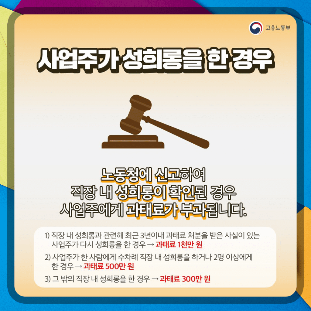 직장 내 성희롱에 대한 신고를 받아야 할 사업주가 성희롱 가해자라면 어떻게 할까요? 이럴 땐 노동청에 신고하면 됩니다. 노동청은 꼭 임금 체불이나 그런 것만 하지 않아요. 근로자의 권익을 보호하는 일에 앞장 섭니다. 신고 혹은 고발한 내용 중 직장 내 성희롱이란 결론이 나고 문제가 있으면 사업주에겐 과태료가 부과됩니다.