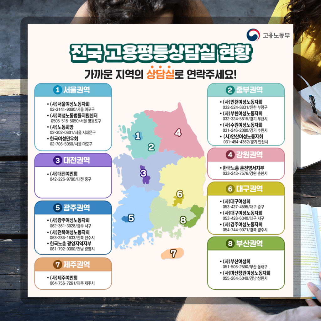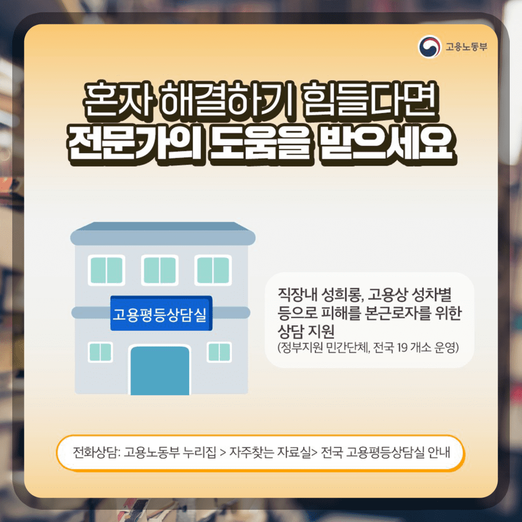 말이 쉽지 직장 내 성희롱, 괴롭힘을 혼자 해결하기란 쉬운 일이 아닙니다. 힘들죠. 이럴 때를 위해서 준비된 곳이 또 있습니다. 바로 전화상담, 전화 상담이 가능한 전국 고용평등상담실 안내 전화번호입니다. 정부지원 민간단체, 전국 19개소 운영 중입니다. 고용상 성차별이나 직장 내 성희롱 피해자를 위한 상담을 지원합니다.