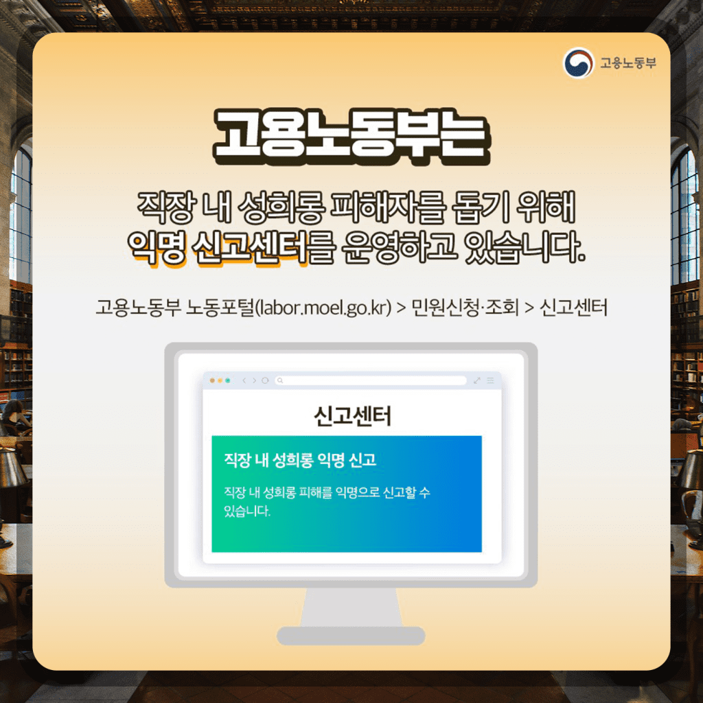 고용노동부는 직장 내 성희롱 피해자를 돕기 위해 익명 신고센터도 운영합니다. 여긴 고용노동부 노동포털, 민원신청 조회로 들어가 신고센터를 이용하면 익명으로 신고센터를 운영합니다.