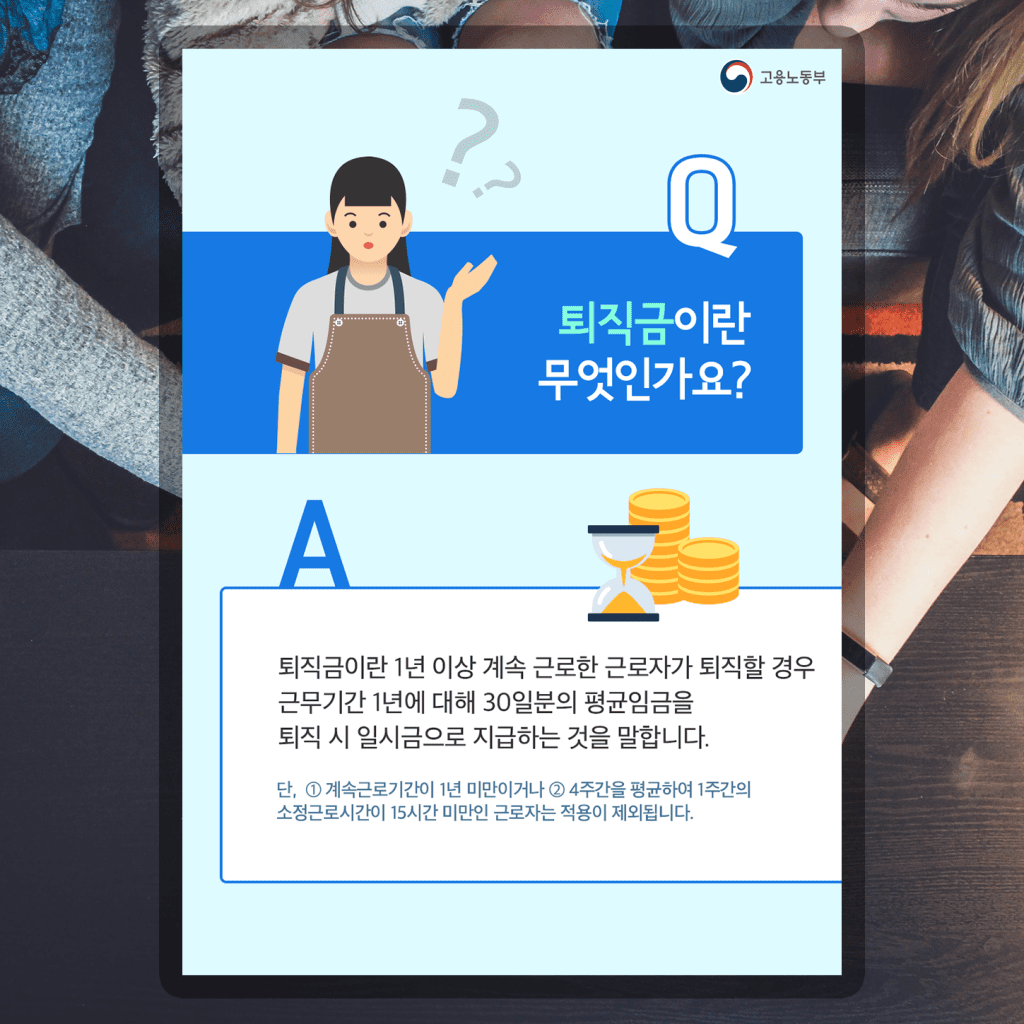 일단 퇴직금이란 1년 이상 계속 근로한 근로자가 퇴직할 경우 근무기간 1년에 대해 30일분의 평균임금을 퇴직 시 일시금으로 지급하는 것을 말합니다. 다만, 계속 근로기간이 1년 미만이거나 4주간을 평균하여 1주간의 소정근로시간이 15시간 미만인 근로자는 퇴직금 지급기준에서 제외됩니다.