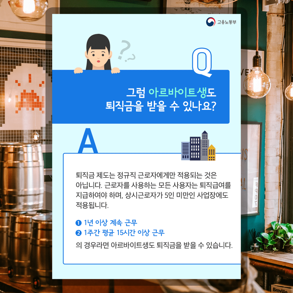 말씀드렸듯 퇴직급여는 정규직 근로자에게만 적용되는 것은 아닙니다. 근로자를 사용하는 모든 사용자는 퇴직급여를 지급하여야 하며, 상시근로자가 5인 미만인 사업장에도 적용됩니다. ① 1년 이상 계속 근무, ② 1주간 평균 15시간 이상 근무해야 합니다. 그리고 위의 경우라면 아르바이트생도 퇴직금을 받을 수 있습니다.