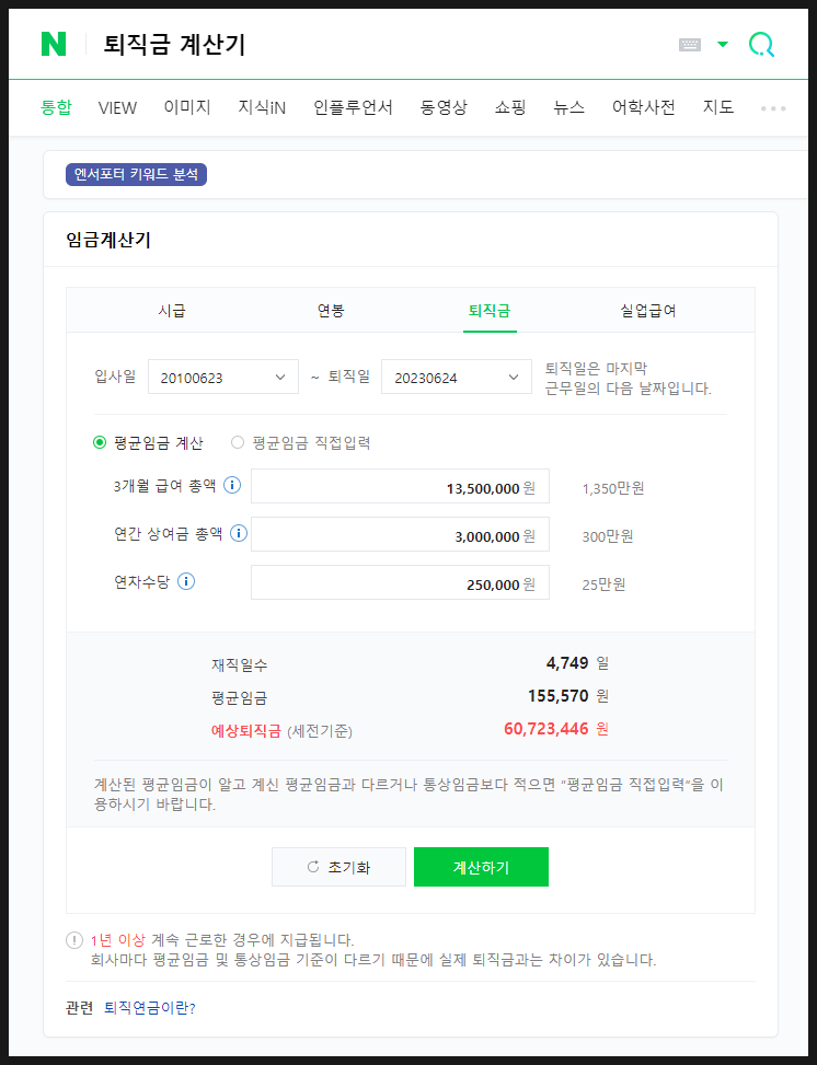 일단 퇴직금 계산기는 네이버에서 검색해볼 수 있습니다. 이외에도 검색 결과를 살펴보면, 상단에 제법 많은 서비스 사이트가 출력됩니다. 일단 퇴직금 계산 방법 중 월급이 450만원이고, 총 13년 근속한 경우를 예시로 계산해보겠습니다. 이걸 계산해보면 연간 상여금 총액은 3,000,000원으로 하고, 연차수당은 250,000원으로 해서 계산하면 예상 퇴직금은 재직일수는 4,749일입니다. 평균임금은 155,570원이고 예상 퇴직금은 60,723,446원입니다. 조금 틀릴 순 있을 것 같아요.이것도 엄청난 금액이네요. 그러니까 뉴스에서 말하는 퇴직금이 3억에서 4억이 될려면 연봉이 1억에서 2억 정도는 되어야 가능합니다. 이렇게 해서 오늘은 퇴직금에 대해 이것저것 알아봤습니다. 퇴직금 지급기한, 지급조건, 퇴직금 계산방법에 대해 알아봤습니다. 조금 어렵게 생각이 든다면, 퇴직금 계산기를 검색해 한 번 계산해봅시다.